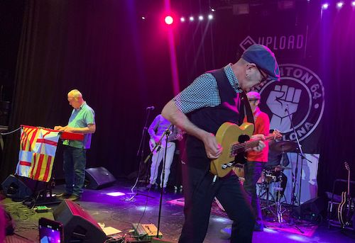 En el teclado colgaba la bandera de Barcelona y en el fondo el puño de Brighton 64, dos iconos de la banda que eran necesarios para remarcar la identidad. No con puntualidad inglesa, pero tampoco lo son, salieron al escenario y la ovación fue sonora, fuerte y sincera, es decir, todos estábamos igual, con ganas de nostalgia, recuerdos, música y buenas vibraciones, además de las grandes dosis de mala leche que han desarrollado en esta nueva época. Comienzan con «Conflicto con tu ayer» y dejas de tocar el suelo porque la gente te lleva de un lado para otro, mientras que te cae encima algo parecido a un cubata y sobre todo cerveza, «El país de Mortadelo y Filemón» nos sirve para cagarnos colectivamente en todos los hijos de puta que pueblan las altas esferas de este estado.