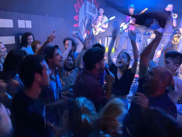 A partir de ahí no hay piedad para los condenados, a muerte, a degüello, sin contemplaciones, se suceden los juegos con el público, el saxo de Eloi Aracil se hace más poderoso y. grande por momentos, mientras que Cesar Canut se transforma en pieza clave, visual y musicalmente, con solos que levantan las pasiones de las primeras filas. Ya está el pescado vendido, pero hay que rematarlo y hacerlo bien. Jordi se lanza a la piscina y hasta donde le respeta el cable del micro, se entremezcla con la gente provocando un pogo generalizado que a buen seguro escucharon los que pasaban con el metropolitano entre Badal y Pl. Sants o viceversa.
