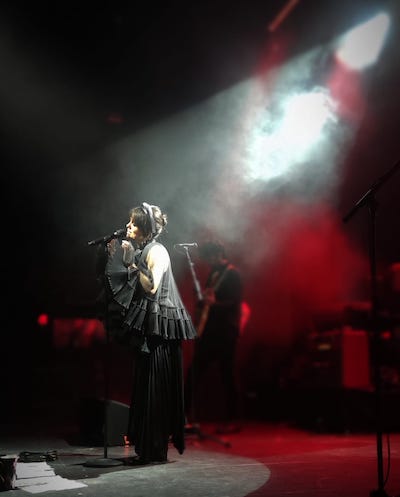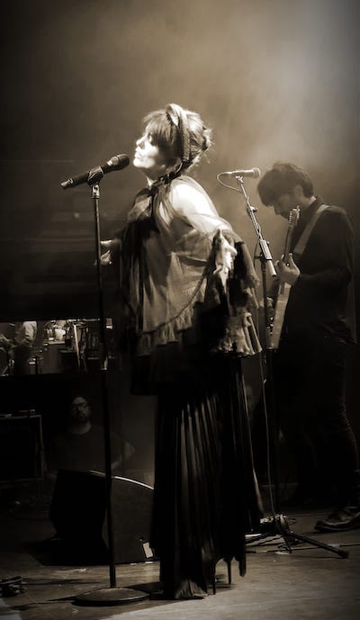 Pero todos esos prejuicios se desvanecieron en el preciso instante en el que se materializó en escena con el tema que da título a su último disco, de aires muy cinematográficos. Fue suficiente verla salir, sobrada de carisma, con su porte victoriano, tacón de aguja y de negro de la cabeza a los pies para caer rendido ante ella. Sensación que no desapareció durante la hora y media que nos regaló a la (escasa, media entrada) audiencia que se dio cita en la Apolo. En cuanto a los músicos que la acompañaban se refiere, me esperaba una anodina banda de soporte, situada detrás de ella para no robarle protagonismo, pero nada más lejos de la realidad, mucho nivel el que atesoraban, y bastante jóvenes. Disfrutando con lo que hacían y con sus momentos de lucimiento, especialmente el guitarrista.