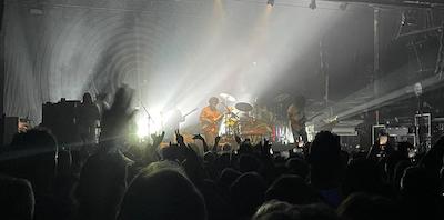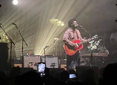 Y poco pasadas las nueve de la noche se apagaron las luces y empezó el viaje, los músicos tomaron posiciones: guitarra, bajo, batería y teclados más dos cantantes (me niego a llamarlas coristas, no les hace justicia) para que Michael hiciera su entrada mientras sonaban las primeras notas de la preciosa «Piano joint (this kind of love)» del tremendo «Kiwanuka» (2020), disco que venía a presentar, dos años después, tras dos aplazamientos pandémicos y que fue interpretado casi en su totalidad. Desde un primer momento se sentía que aquello era algo especial, la banda ejecutaba los temas a la perfección dotándolos de músculo guitarrero cuando se precisaba y de groove negro cuanto tocaba, el teclado aportaba esos arreglos y matices tan bonitos de las canciones, incluso engrandeciéndolas y las fabulosas hermanas soul mencionadas llevaban las canciones a otro nivel además de darle bien a los bongos y a las maracas en algún tema. Y Michael absolutamente maravilloso, enorme, pleno de voz y de una simpatía y buen rollo arrolladores, abrió su bolsillo y nos metió a tod@s en él durante todo el recital.
