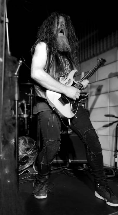 Y a las diez y veinte, con la parroquia ya bien empapada en cerveza (por dentro y por fuera) tomaron el escenario ESTERTOR, barceloneses, casi todos del barrio y más jevis que un bocata de clavos. Empezaron dándonos la espalda mientras sonaba una intro tras la que atacaron con «Assimilated flesh», primer corte de su último disco «Tales from the ancient grave» (2021), el cual presentaban por primera vez en la ciudad condal. El citado álbum lo tocaron casi entero, se ve que le tenían ganas, aunque también se acordaron de algunas canciones muy queridas de su debut «Buried in morningside» (2017) como «Nekromantik» o «Reanimator», antes de la cual su cantante y letrista Edu, gran fan y conocedor del cine y la literatura de terror, nos recordó a H. P. LOVECRAFT, pues la película ochentera que da título al tema está basada en uno de sus relatos (para que luego digan que el Heavy no es cultura!).