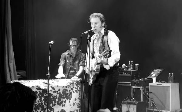 Y poco pasadas las diez de la noche, y ante una sala en ebullición, salieron al escenario DADDY LONG LEGS, el otrora trío (y antes dúo) reconvertido en cuarteto con la incorporación de un teclista. Todo en ellos es deliciosamente retro, la impagable imagen y peinados, los instrumentos, la batería reducida a su mínima expresión, tocando el aéreo con una maraca, el protagonismo de la armónica y un peculiar micrófono inalámbrico del que hacía uso el bueno de Brian Hurd, cantante y alma máter de la banda, que produce un efecto cavernoso en la voz y dota a su música de ese sonido tan característico, ese blues crudo, guarro, embadurnado de garage que te remite a la JON SPENCER BLUES EXPLOSION o los SONICS más asilvestrados.