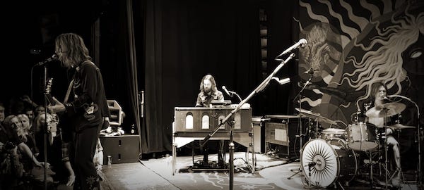 Y pasadas las nueve y media el plato fuerte, unos DEWOLFF en modo conquista del mundo que no fallaron, es más, maravillaron. Lo primero que sorprendió es que se presentaran ellos tres solos sin ningún apoyo en escena, habida cuenta de la cantidad de coros y vientos que suenan en su nuevo disco, pero no, ellos se las arreglan para que no los eches de menos. Un set muy equilibrado con cuatro temas del reciente álbum, entre ellas «Nightrain» (menudo pepinazo) que ya presentaron en sus conciertos con los cuervos, la sinuosa cadencia de «Will o’ the wisp», la soulera «Heart stopping kinda show» y esa barbaridad de dieciséis minutos, una cara entera en el vinilo, «Rosita» que aquí incluso alargaron. Unas cuantas canciones de esa sorpresa que fue «Tascam tapes» (2020), su famoso disco grabado en una furgoneta por menos de cincuenta euros, y algunas de «Wolffpack» (2021), «Thrust» (2018) y de «Roux-ga-roux» (2015). Tienen para elegir estos treintañeros entre su ya extensa discografía, y a quienes a su corta edad se les puede calificar ya de veteranos. Empezaron en esto de adolescentes (Luka el batería tenía catorce años) y pasaron directamente del instituto a la vida rockera sin pasar por la universidad, a lo Lebron James. Su universidad fueron los garitos y festivales de toda Europa. Giras y más giras que han ido puliendo su descomunal talento.