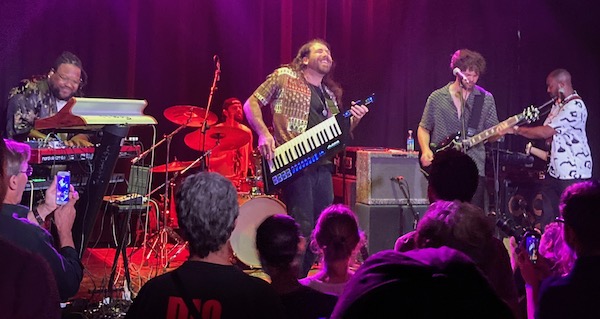 Y así arrancó un show, de hora y media, ecléctico y non stop. Enlazaban tema tras tema con unos efectivos arreglos de batería. Corey Frye, su frontman, es un tipo simpático que empatiza con la audiencia y con sus colegas de escenario, a la primera. Y es lo que te dan a entender. Que son un grupo de colegas haciendo lo que más les gusta. Buen rollo, miradas cómplices y buena, muy buena música. Puedes embelesarte un buen rato observando a cada uno de sus componentes. Maxi me dijo que me fijara en Max Newman. Guitarrista de los buenos. Muy joven y que apunta muy buenas maneras. Un sonido nítido de Gibson SG y saber estar. Magnánimo en los solos, disciplinado con la rítmica y sin duda, admirador de David Gilmour. Una delicia. Rob Walker, una maravilla con el bajo y también al teclado. Produciendo unos graves que hacían temblar la sala. Reuben Gringrich batería, es una locomotora. Lleva el peso de un gran setlist. Muy elaborado, con permanentes cambios de ritmo y estilo. Una máquina. Y finalmente, Smiley, el teclista. Un entusiasta contagioso. Mucha actitud y muchos recursos.