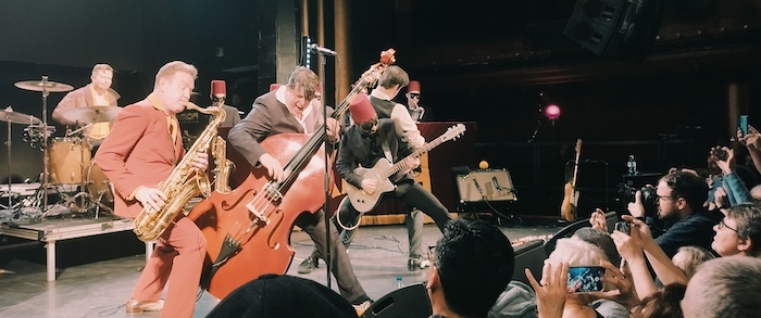 Aun con un tramo final de año que se nos había cargado un poquito (El concierto navideño de TH’ BOOTY HUNTERS, La nit dels innocents y SATURNA & FRIENDS) no pudimos resistirnos a disfrutar de LOS MAMBO JAMBO ARKESTRA. Han sido varias las veces en las que hemos visto en directo a Dani Nel.lo, ya fuera con los MJ o con los SAXOFONISTAS SALVAJES, pero aún no habíamos tenido ocasión con la citada Arkestra. Además, en la grande de Apolo, que eso siempre suma, la mejor sala de la ciudad, la que mejor suena y la más bonita. Así que allí nos plantamos pasadas las nueve de la noche (un poco justos de tiempo, todo hay que decirlo) para disfrutar de una velada de buena música instrumental y pegarnos unos meneos para bajar los aperitivos, los canelones y los dulces que solemos tod@s comer en abundancia en estas fechas navideñas. No tuvimos problema alguno para posicionarnos en tercera fila, en el lado del contrabajo, pues en la sala, aunque presentaba una muy buena entrada, se podía mover uno con comodidad. De hecho no abrieron los palcos de arriba, se entiende que para que la gente se concentrara en la pista y hubiera mejor ambiente. Así pues, listos y preparados para el show a la hora anunciada. Lo primero que llamaba la atención era el mimo con el que se había preparado el escenario, el kit de batería en alto, detrás de este, un pedestal que ocuparía un personaje del que hablaremos luego y a cada lado una fila de bancadas para la Arkestra adornadas con unas bonitas lonas con la leyenda «LOS MAMBO JAMBO ARKESTRA». Todo preparado para una actuación que no se hizo esperar mucho, pues a las nueve y cuarto ya fueron tomando asiento l@s doce (sí, doce) componentes de esta numerosa sección de viento, para ser más exactos tres trompetas, cuatro trombones y cinco saxos. Todos y todas ataviad@s con birretes y antifaces, lo que le daba un toque muy divertido al asunto. Tras ell@s tomaron el frente del escenario los cuatro componentes de LOS MAMBO JAMBO, esto es Anton Jarl a la batería, Ivan Kovacevic al contrabajo, Dani Baraldés a la guitarra y Dani Nel.lo al saxo. Detrás de la batería de Anton, como decíamos, había un pedestal que fue ocupado por Héctor Martín, conocido guitarrista de A CONTRA BLUES y RAMBALAYA, el cual pese a estar detrás de todos se erigió en uno de los protagonistas de la velada.