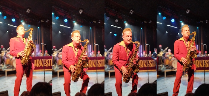 Se intercambiaban los solos, a veces tocaban uno los dos al mismo tiempo y otras veces se los intercalaban, provocándome un ligero dolor de cuello, pues mi atención se iba hacia uno u otro, como si estuviera viendo un partido de tenis, intentando averiguar qué parte tocaba cada cual, geniales ambos. No sabías donde posar la vista, adonde miraras te quedabas embobado, Iván, quien además es el arreglista del grupo, iba superelegante con su traje y sus creepers, aporreaba con maestría su contrabajo y lo daba todo. También era preciosa la estampa de la Arkestra, tod@s sentad@s con una sonrisa en la cara, moviéndose al ritmo, dando palmas y muy pendientes de la partitura que tenían delante, preparad@s para cuando les tocaba intervenir. Dani, el líder, muy agradecido cuando se dirigía al público entre tema y tema, nos contó algunas historias, como cuando recordó los tiempos en los que tocaban en Apolo, en el cabaret burlesque que se organizaba, rindiendo homenaje a Itziar (Madame Taboo) dedicándole la canción «Poderosa». Otro guiño al pasado, de cuando empezaron los MJ, al presentar «Flamin’ hips», referencias a los tiempos pandémicos y las reuniones clandestinas de entonces con «Fiesta en el motel», a l@s polític@s con «Carrera de ratas», o a los saxofonistas de antaño, más concretamente a LEE ALLEN, con «Ases del baile» en la que nos invitó a mover el bullarengue, invitación esta que no dudamos en aceptar. Casi al final del pase, Dani comentó que si los grupos instrumentales americanos de los cincuenta y sesenta hacían versiones de la música de sus series favoritas, por qué no iban a hacer ellos lo propio, para inmediatamente atacar con los títulos de crédito de «El hombre y la tierra» del añorado Félix Rodríguez de la Fuente. El final de fiesta fue un «The whip» antológico con la banda echando el resto, en la cual Héctor bajó de su pedestal para rockear duro con los demás y recibir los vítores del público.
