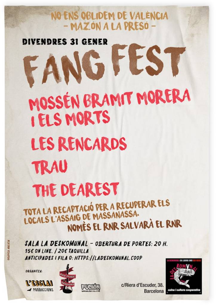 Numerosos músicos lo perdieron todo, absolutamente todo. Satu, de Wau y los Arrrghs, continúa con el agua en el cuello desde esa fecha negra. Él gestiona locales L’Assaig de Massanassa, donde da cabida a numerosos grupos imprescindibles de nuestro ecosistema rock’n’roller y aquello quedó completamente anegado. Por eso, sumamos el Fang Fest a las iniciativas para ayudar. Os invitamos a un conciertazo y un acto de solidaridad activa. Sólo el R’n’R salva al R’n’R.