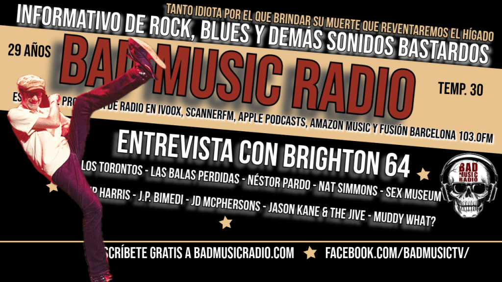 Ya tenemos el guion preparado para el próximo miércoles que emitiremos en Bad Music Radio #511. En él encontraréis una extensa entrevista con Ricky Gil de Brighton 64, hablando del final de la banda, los proyectos que todavía tienen entre manos y de la Bad Music Sessions en la que actuarán el próximo 29 de mayo, en La Deskomunal del barrio de Sants. Entradas a la venta aquí.
