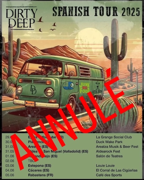 La banda francesa Dirty Deep ha suspendido hoy mismo su gira de ocho actuaciones por la Península, debido a una enfermedad de uno de sus miembros y ser imposible cumplir los compromisos.
