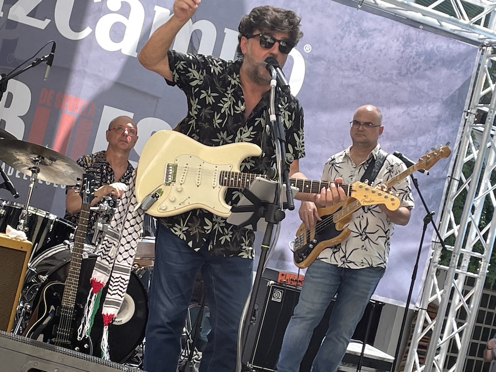 Lolo Ortega, todo un clásico del blues andaluz y nacional, que demostró estar en un momento envidiable de fuerza y virtuosismo, repasando algunos temas de su discografía salpicados con una serie de versiones que encandilaron al público presente. Bajo un sol de justicia la plaza bailó y no paro de corear sus canciones, destacando «Échame un cable», «La puerta de Toledo» y «Blues de la dama», mientras el estupendo catálogo de versiones incluyó, entre otras, «Born In Chicago», «Born In The Bad Sing» y un magistral «Cocaine» de JJ Cale. Con una banda sólida que lo arropó en todo momento a la perfección, Lolo sobrevoló con sus seis cuerdas en una mágica mañana. Tuvo su momento reivindicativo al colgar de su guitarra un pañuelo palestino, aprovechando todo el respetable para gritar «Palestina Libre».