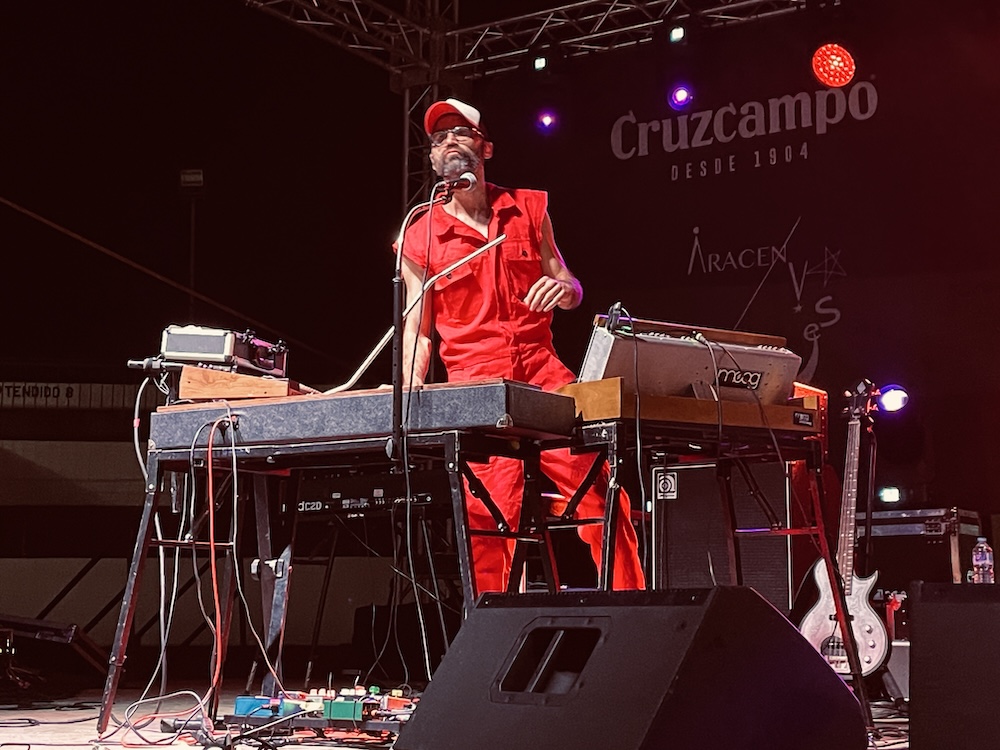 Mi duda era comprobar cómo resultaría una actuación de Kamikaze Helmets en un escenario grande, pues sabía de sobras que en sala pequeña era arrolladores. Borrasca que se disipó rápidamente, porque aunque sus respectivos instrumentos los anclan al entarimado sin posibilidad de movimiento, Gabri y Kike, redujeron el escenario a su reducido y complejo back line.