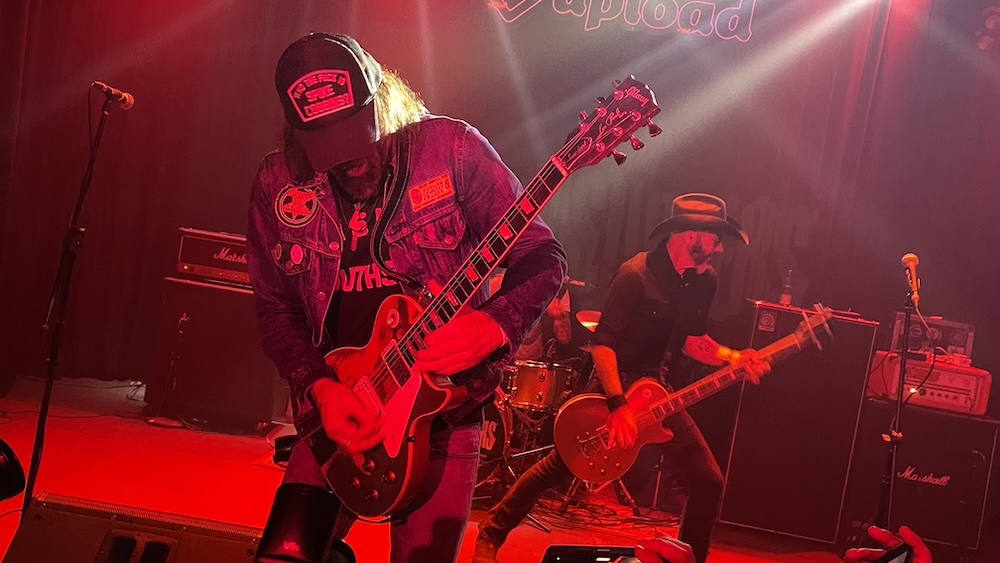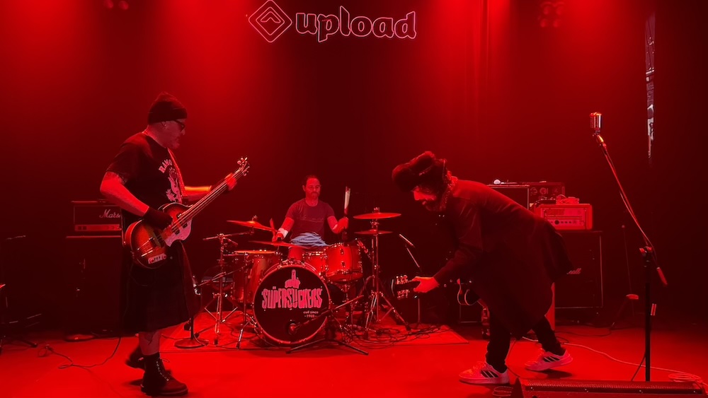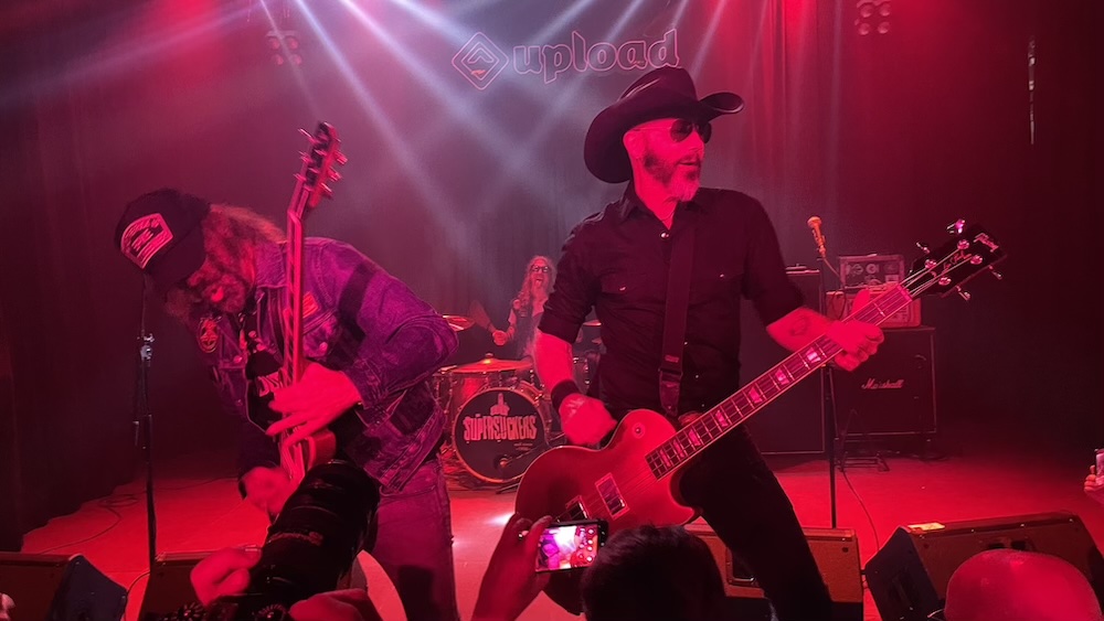 Tras unos minutos de música enlatada, surgió de detrás de la cortina de Upload, «La banda más grande de Rock ‘n’ Roll del mundo», tal y como ellos se denominan, que no seré quien lo afirme categóricamente, pero no es menos cierto que son uno de los grupos más divertidos que puedes echarte a la cara desde hace décadas. Los chupa neuronas son Eddie Spaghetti, líder, voz principal y bajo; Marty Chandler «Metal», carisma, guitarra y voz; “Capitán” Chris Von Streicher, cavernícola, batería y coros. Con ellos es imposible no divertirse, quedarse quieto o no sudar la gota gorda, porque son un torbellino incesante, que durante algo más de cincuenta minutos no dan tregua; no es necesario más minutaje, ni ellos ni nuestros cuerpos podrían soportar tanta energía acumulada sin explotar.