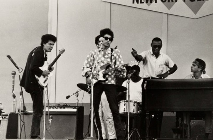 Fue el 25 de julio de 1965, y era la primera vez que Dylan se presentaba con una banda eléctrica. La reacción no se hizo esperar: lo abuchearon, le tiraron de todo sobre el escenario y le acusaron de traidor. Pero gracias a la bravura de Bloomfield y compañía, las críticas se convirtieron pronto en felicitaciones. Algunas semanas después, Bloomfield recibió una llamada de Bob Dylan, invitándole a participar en Nueva York en las sesiones de grabación del álbum Highway 61 Revisited, donde Bloomfield conoció al teclista Al Kooper. Kooper recuerda aquel día en su biografía, titulada Backstage Passes: «Dylan entró violentamente por la puerta, y tras él estaba un chico raro que llevaba una guitarra Fender Telecaster sin funda. Era pleno invierno y la guitarra estaba toda bañada de lluvia y nieve. El chico no se apesadumbró: se fue a una esquina, la secó con un trapo y después se acercó a un amplificador. Enchufó la clavija y se empezó a oír una de las mejores guitarras jamás escuchadas en la historia del rock». En 1965, The Butterfield Blues Band grabó en los estudios Elektra el monumental East-West, cuyo punto focal es el tema que le da título, de 13 minutos de duración, escrito por el teclista Naftalin y por Gravenites.